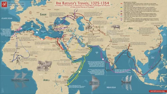 أعيد مؤخرا رسم خريطة لمسار الرحالة المغربي ابن بطوطة، توثق تنقلاته في القرن الرابع عشر من سواحل المغرب الأطلسية إلى أقاصي الصين، في رحلة تجاوزت 120 ألف كيلومتر عبر قارات وممالك ومراكز علمية.